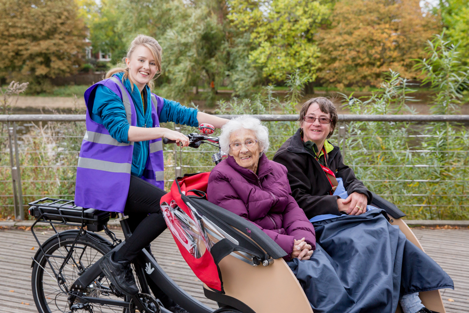 The Rides are a simple but brilliant idea. Volunteers offer free comfortable rides on two special electric-assist Triobike Taxis, each with a passenger seat for two up front. Everyone rides together, chats and has fun on cycling trips out into parks, green spaces and around the best city sights! We work with partner organisations to offer Rides to residents of care homes, independent living and retirement communities and to members of community support organisations across York.