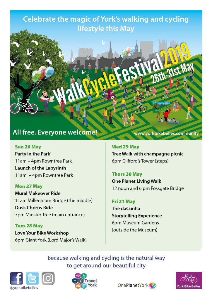 You are invited to a week of free and fun walks, rides, socials, workshops and creative activities from Sunday 26 to Friday 31 May 2019 to celebrate the magic of York’s walking and cycling lifestyle.