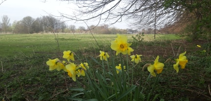 I wandered it yesterday in the glorious spring sunshine and it was a revelation! You can take a circuit along the broad footpath by the river, up onto the Field, and back along the walk/ cycle path by Danesmead Wood. There are lovely views back towards the Bridge, with cheery daffodil clusters here and there along the route. And the trees encircling the Field were starting to burst into spring – with tiny white blossom, fresh green leaves and swelling buds.