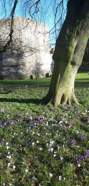 Start in the Museum Gardens and pause to admire the pool of pink cyclamen under the pear-barked beech by the main path from town. Then take a stroll round to the right of the Abbey to a joyful emerging patch of daffodils under some plane trees by the exit to the ‘Edible Wood’. Follow the path out through the ‘Wood’ and you come to Bootham Bar. Walk towards the Minster and turn left into Dean’s Park to relish its splendid multicoloured display of crocuses.